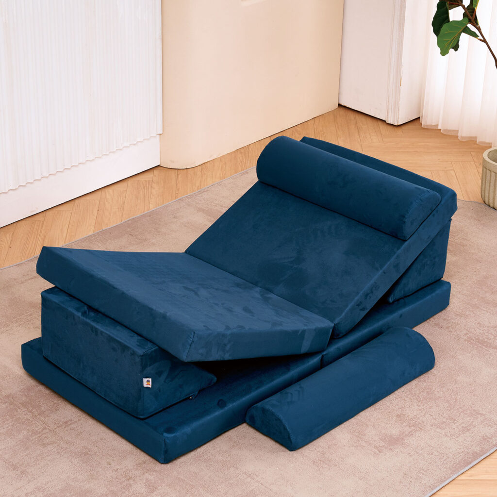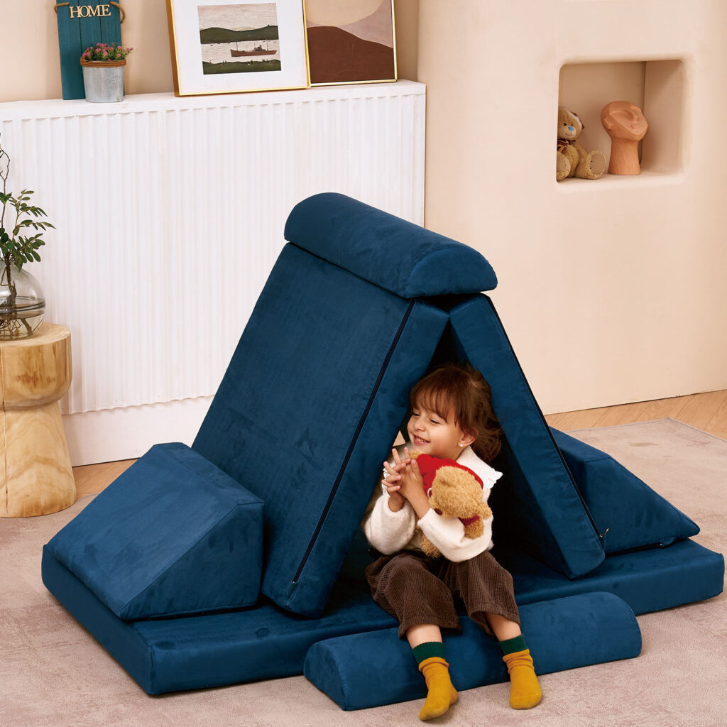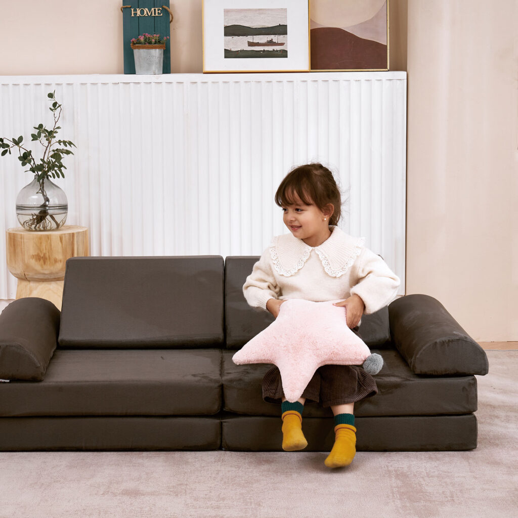 The 8-piece Jela Play Sofa is made from high-quality foam covered in durable, washable fabric that’s meant to be played with over and over again. The base(x2), foldable cushion(x2), two (2) triangle back pillows, two (2) rectangle arm rests, and personalized pillow can be removed and placed or balanced in endless configurations. And when the playing is done, they can quickly and easily be reassembled to a couch for some quiet time, reading, or napping.